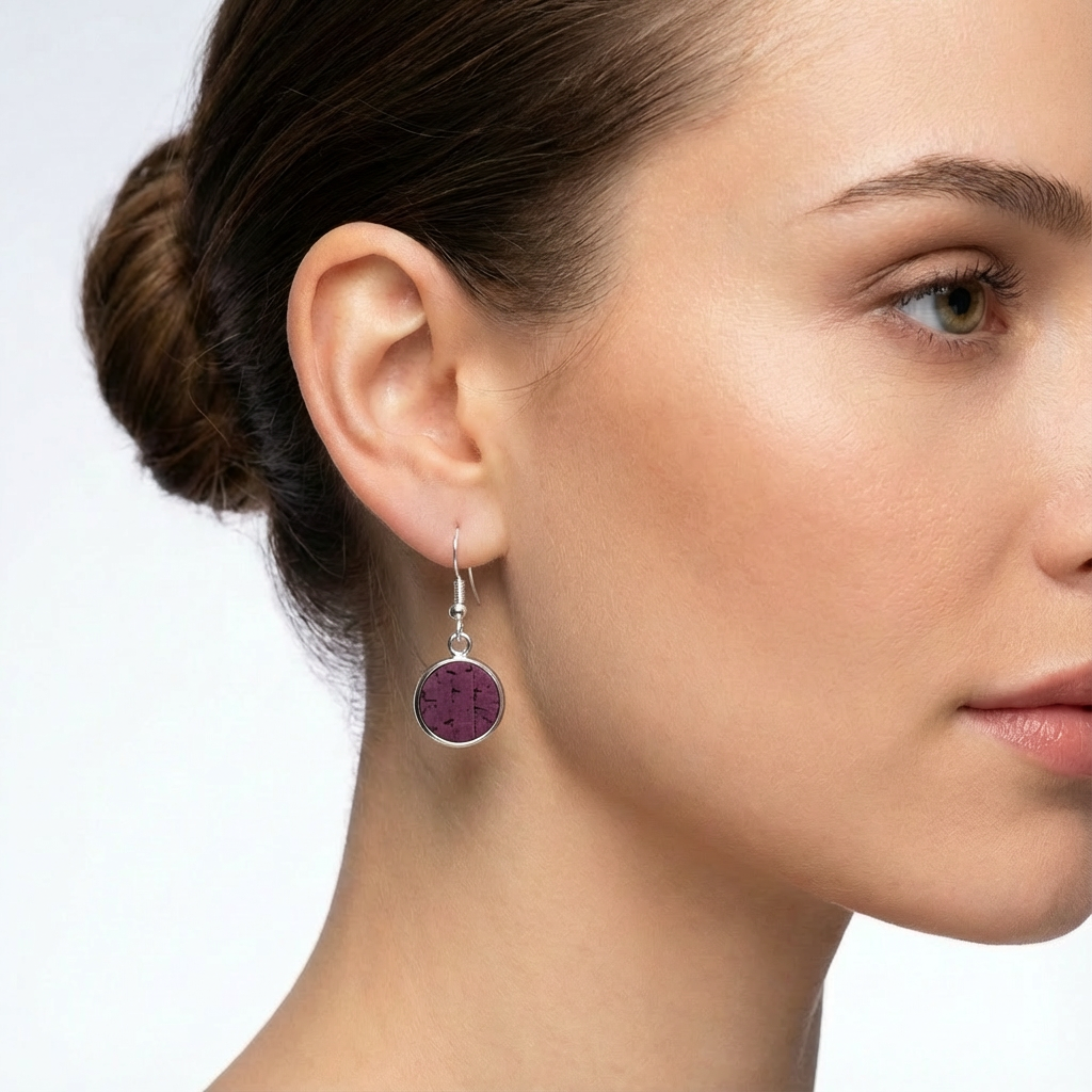 Indulge in refined elegance with our Wine Red Circle Drop earrings. The deep burgundy wine hue offers timeless sophistication, while the natural cork fabric adds unexpected organic texture and conscious craftsmanship. Each 10mm cork disc showcases unique veining patterns, creating subtle depth and visual interest. The simple silver hardware allows graceful movement without overwhelming your look. These lightweight dangles transition seamlessly from office to evening, offering versatile elegance that complements all skin tones. • 10mm circular cork disc in burgundy wine red • Eco-friendly cork fabric with natural grain • Simple silver wire hooks with two small jump rings • Nickel-free, hypoallergenic materials • Ultra-lightweight dangle design • Handcrafted vegan jewelry • Organic texture makes each pair one-of-a-kind. Care: Clean with damp cloth as needed. Avoid harsh cleaners.